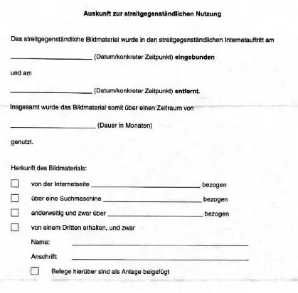 In dem Schreiben der Münchener Anwälte wird die Abgabe einer strafbewehrten Unterlassungserklärung verlangt und Auskunft darüber, in welchem Umfang das abgemahnte Foto genutzt worden ist. FROMMER Legal hat der Abmahnung insoweit zwei Vordrucke beigelegt mit den Titeln „Angebot zum Abschluss eines Unterlassungsvertrags“ und „Auskunft zur streitgegenständlichen Nutzung“: