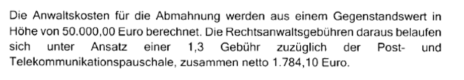 Hinzuaddiert werden sodann Anwaltskosten aus einem von IPPC LAW genannten Streitwert (hier 50.000,00 Euro):