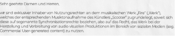 Der Empfänger des Forderungsschreibens hätte, ohne im Besitz einer ausreichenden Lizenz zu sein, eine geschützte Musiktonaufnahme in den sozialen Medien verwendet. Die SoundGuardian GmbH behauptet hier, Inhaberin der entsprechenden ausschließlichen Nutzungsrechte zu sein.