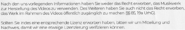 Hierbei ist jedoch Vorsicht bei der Verwendung fremder Werke, wie etwa Bildern und Musik geboten. Hierbei genügt es bereits für eine Urheberrechtsverletzung, wenn lediglich Teile bzw. Ausschnitte eines Musikstücks verwendet werden.