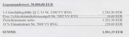 Um das Vergleichsangebot augenscheinlich attraktiver gestalten, weist Rechtsanwalt Sandhage im Anschluss an das Vergleichsangebot darauf hin, dass im Falle der Ablehnung des Angebots eine strafbewehrte Unterlassungserklärung abgegeben und Abmahnkosten in Höhe von 1.501,19 Euro bezahlt werden müssten. Der Unterlassungsstreitwert der hiesigen Angelegenheit würde 30.000,00 Euro betragen.