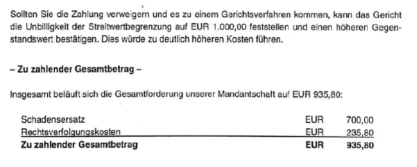 Die Abgemahnten sollen gegenüber Warner Bros. eine strafbewehrte Unterlassungserklärung abgeben. Ein Muster dafür liegt meist vorformuliert von Frommer Legal der Abmahnung bei. Bei der Verbreitung eines einzigen Filmes wird zumeist ein Schadensersatzbetrag in Höhe von 700,00 Euro verlangt. Für die Schadensberechnung wird auf die sogenannte Lizenzanalogie zurückgegriffen. Zu den 700,00 Euro rechnen Frommer Legal dann noch 235,80 Euro Abmahnkosten aus einem Streitwert von 1.700,00 Euro hinzu. So ergibt sich der gerade noch dreistellige Gesamtbetrag von 935,80 Euro: