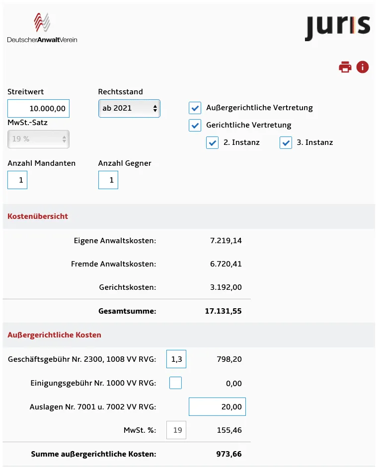 Das abmahnende Unternehmen macht meistens einen sogenannten Unterlassungsanspruch geltend. Anspruchsgrundlage dafür ist § 8 des Gesetzes gegen den Unlauteren Wettbewerb, kurz UWG. Der abgemahnte Shopbetreiber soll binnen einer kurzen Frist eine strafbewehrte Unterlassungserklärung abgeben. Damit wird ein teures gerichtliches Verfahren verhindert. Wie teuer bereits eine kleine wettbewerbsrechtliche Streitigkeit vor Gericht werden kann, zeigt folgende Grafik. Wir legen hier einen für wettbewerbsrechtliche Abmahnungen geringen Streitwert in Höhe von 10.000,00 € zugrunde: