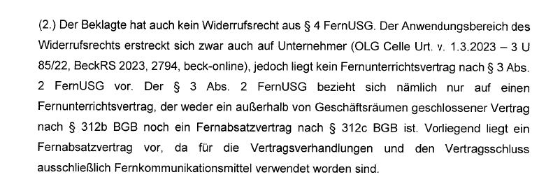 Das Landgericht Hannover hat einem von unserer Kanzlei vertretenen Consulting-Unternehmen Recht gegeben. Das Landgericht gab unserer Zahlungsklage mit einer Hauptforderung in Höhe von 5.950,00 Euro statt. Es lehnte dabei in der Klage die Anwendbarkeit des Fernunterrichtsschutzgesetzes (FernUSG) ab. Die Parteien stritten sich zunächst um die Verbrauchereigenschaft der beklagten Person. Das Landgericht kam zu der Auffassung, dass der Beklagte wohl eigentlich Verbraucher wäre, jedoch im hiesigen Fall nicht als Verbraucher zu behandeln wäre, weil er insoweit anders lautende Angaben im Internet und gegenüber der Klägerin gemacht hätte, die auf eine Unternehmereigenschaft schließen ließen. Auch das derzeit viel in Rede stehende FernUSG sei nicht anwendbar, weil es sich bei dem geschlossenen Vertrag um einen Fernabsatzvertrag handeln würde. Gemäß § 3 Abs. 2 FernUSG könne ein Fernabsatzvertrag nicht zugleich Fernunterrichtsvertrag sein.